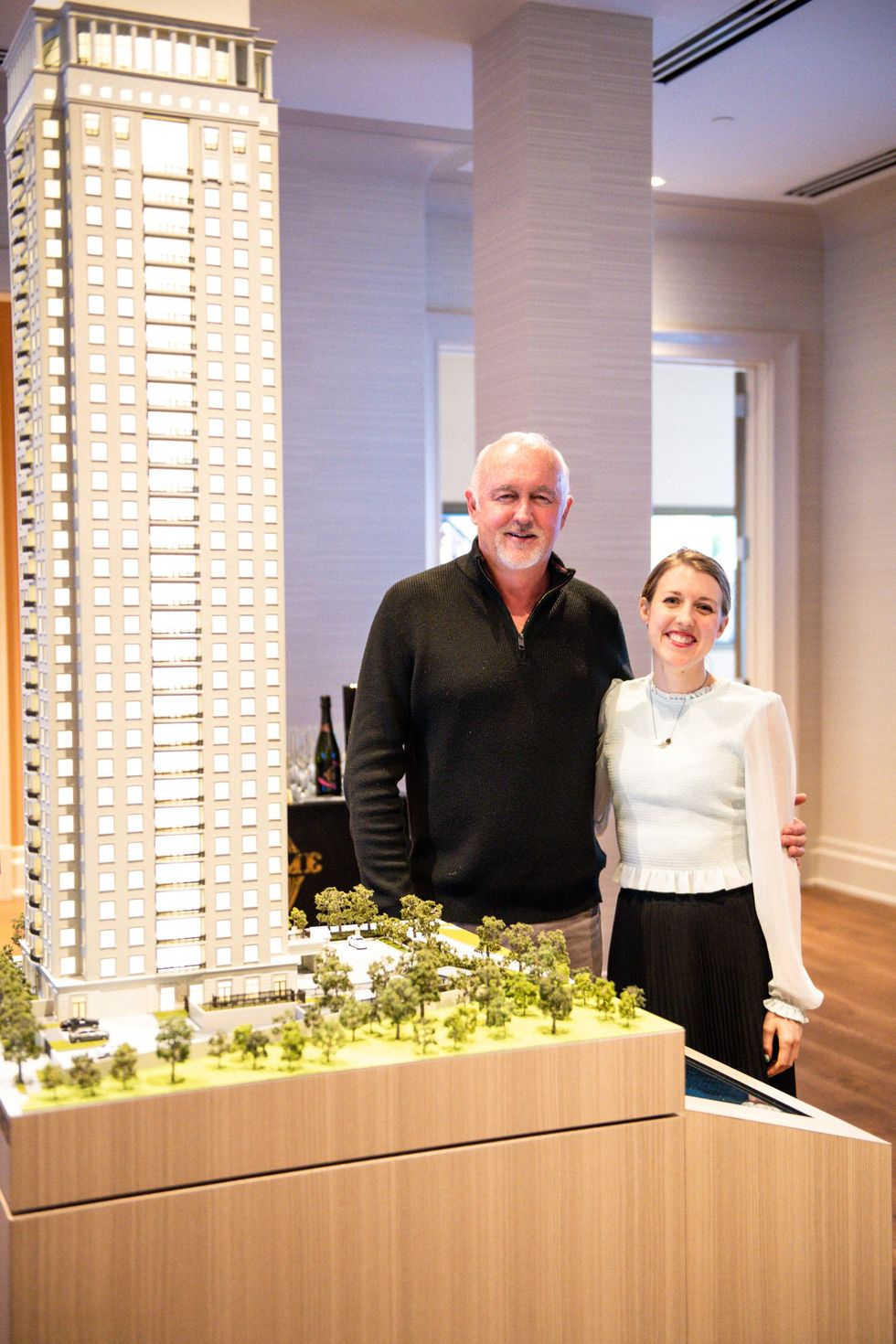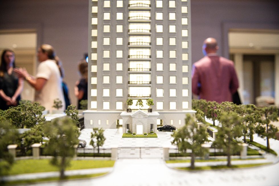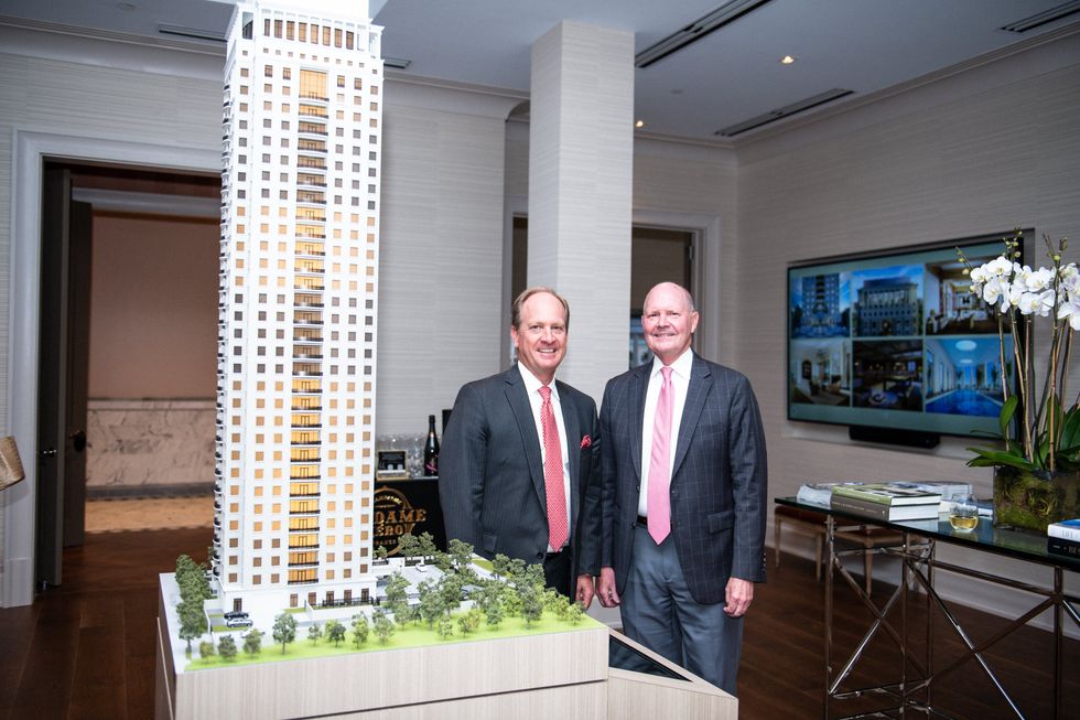 The new building will stand 34 stories above the posh enclave of Tanglewood and the nearby Uptown District. Boasting truly regal architecture, it will wear a crown fashioned of 40 dramatically lit columns surrounding an opulent top-floor pool deck. The jovial Miller, who addressed the crowd at the party, has said that Tanglewood is “close to the emotional heart of Houston” and that he and his family are “dedicated to continuing its stewardship.”
