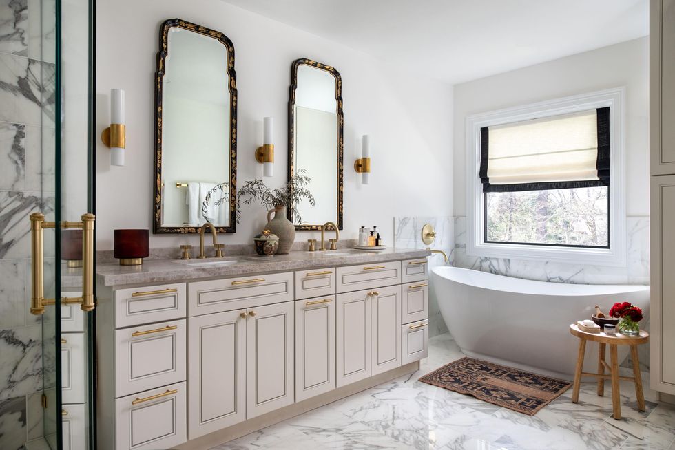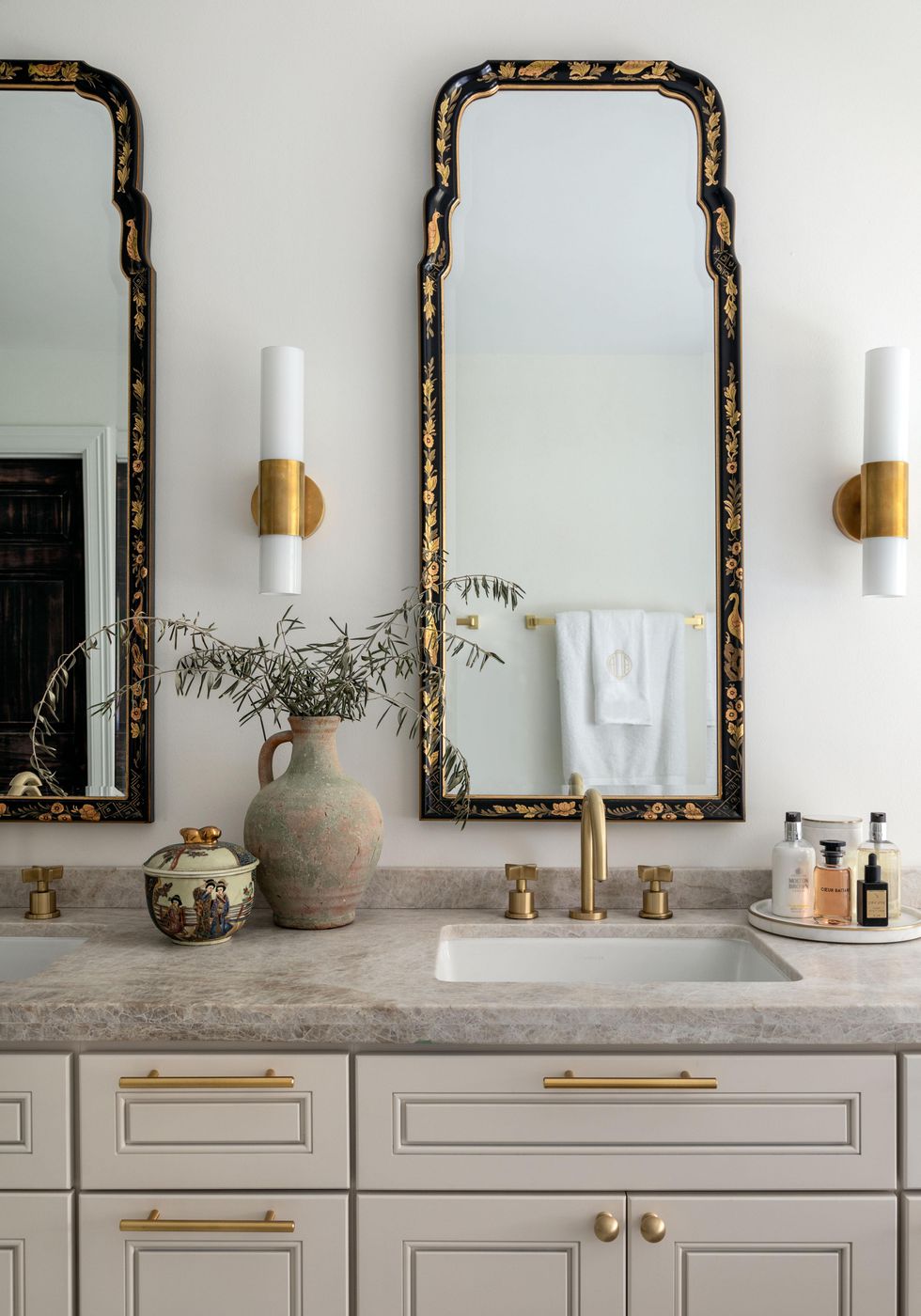 In the master bath, which also features a lot of honed marble, Oberhauser deployed warm paint tones, solid brass fixtures and Calacatta Gold marble to create a cozy feeling. The warm tones pair well with the antique Asian mirrors she found at an estate sale that hang about the his-and-hers sinks.