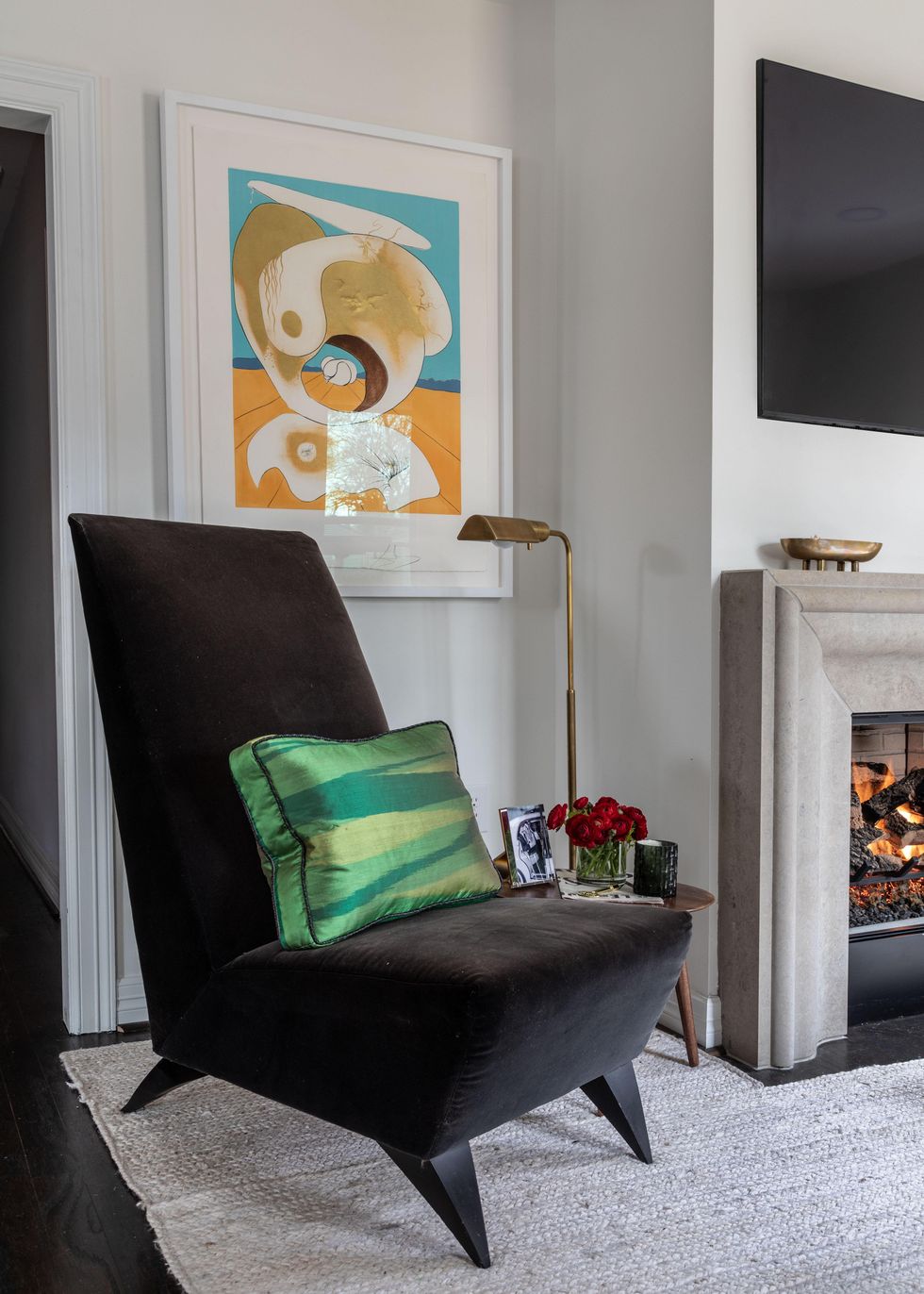 A standout locale in the designer's living room, which got a new limestone fireplace during the remodel, is a writing nook that features a 17th century secretary desk and an original Chiavari chair from Italy that she fell in love with during the week of her wedding. Also in the living room, there's a vibrantly colored original Salvador Dali lithograph that Oberhauser and her hubby purchased together as their wedding gift to each other. It's another one of the great deals she's been finding at auction houses throughout the pandemic.