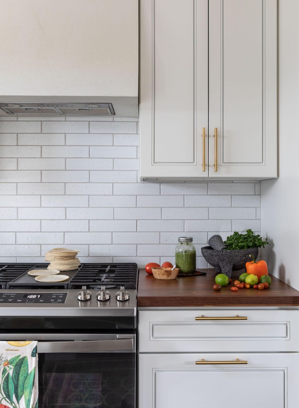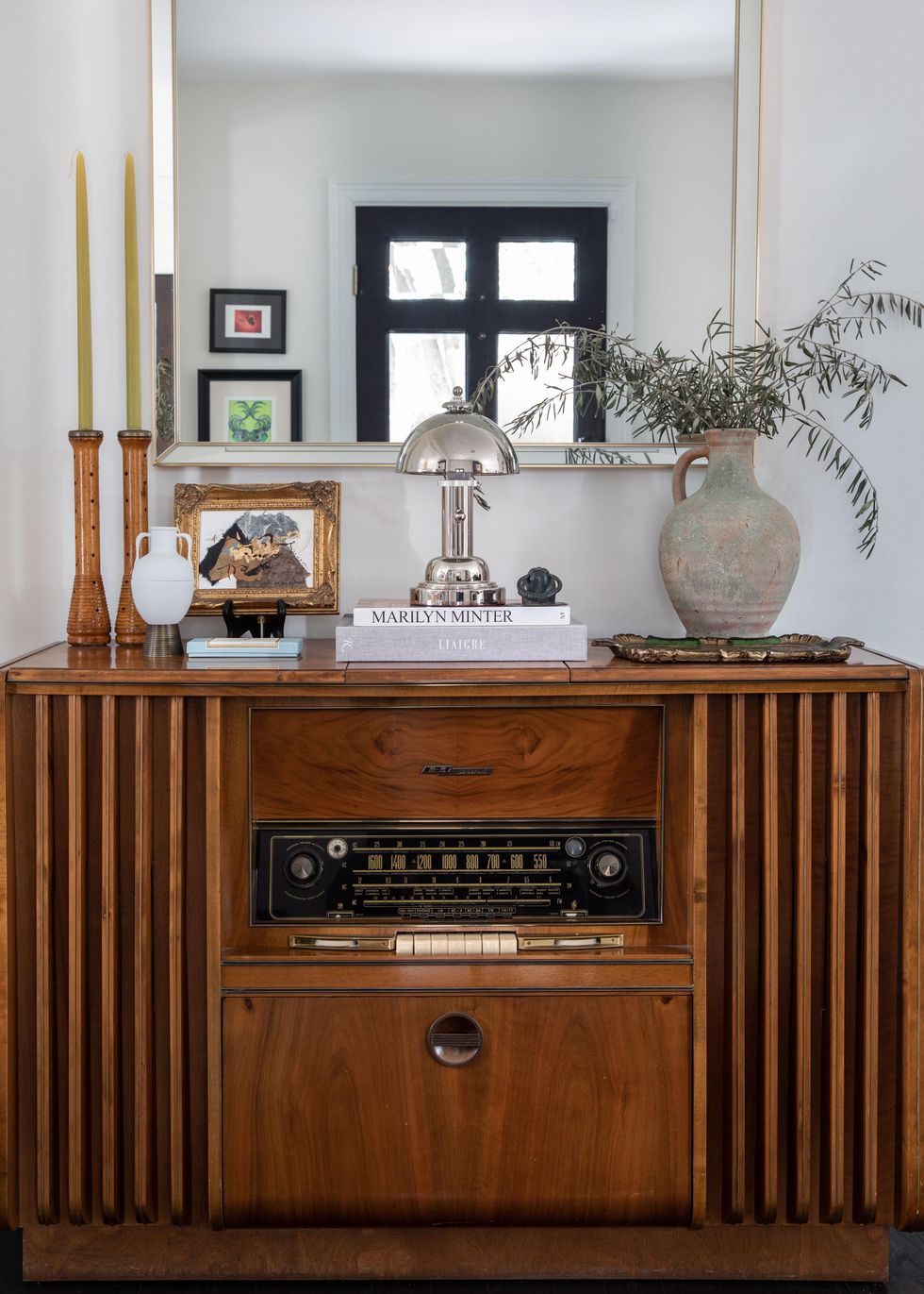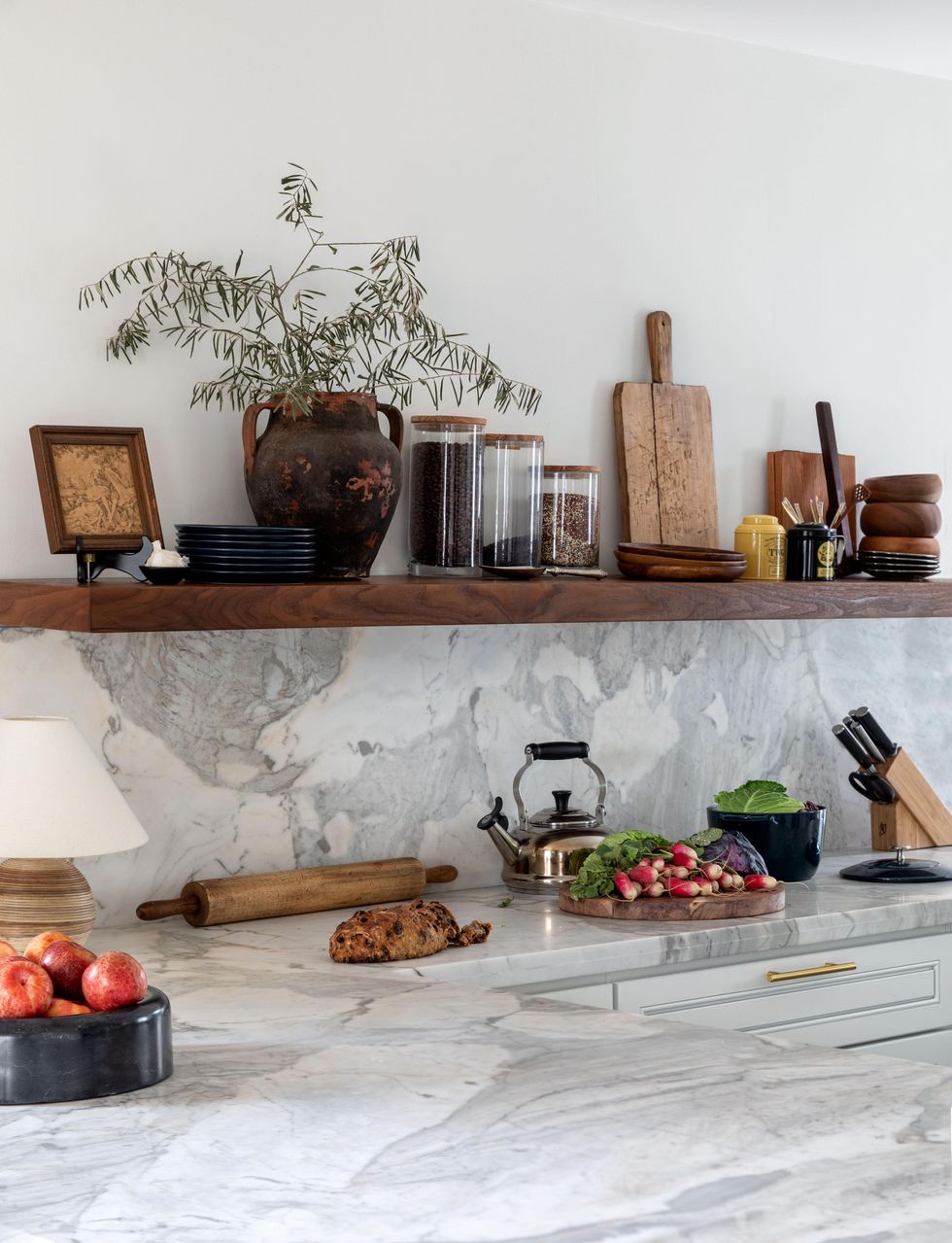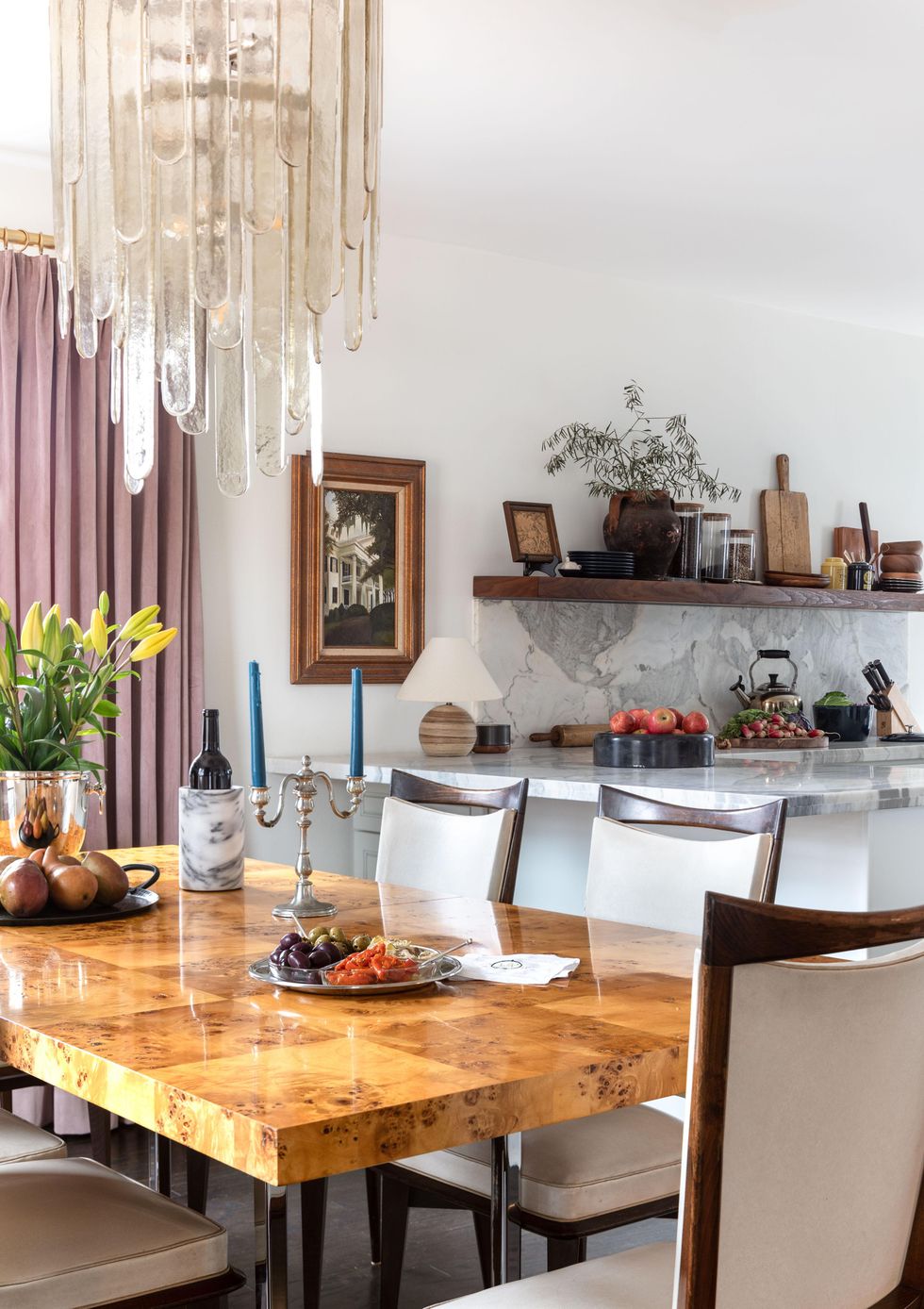 Her impulsive decisions worked, and her redesigned home perfectly features the eclectic glamour she is known for while still holding true to the aesthetic of the ranch-style home. For her kitchen reno, she put in a honed marble butcher's block, got rid of the upper shelving on one side of the kitchen and added in a beautiful clay tile backsplash to provide the warm space with a textured and natural luster — a change of pace from ubiquitous white subways tiles.