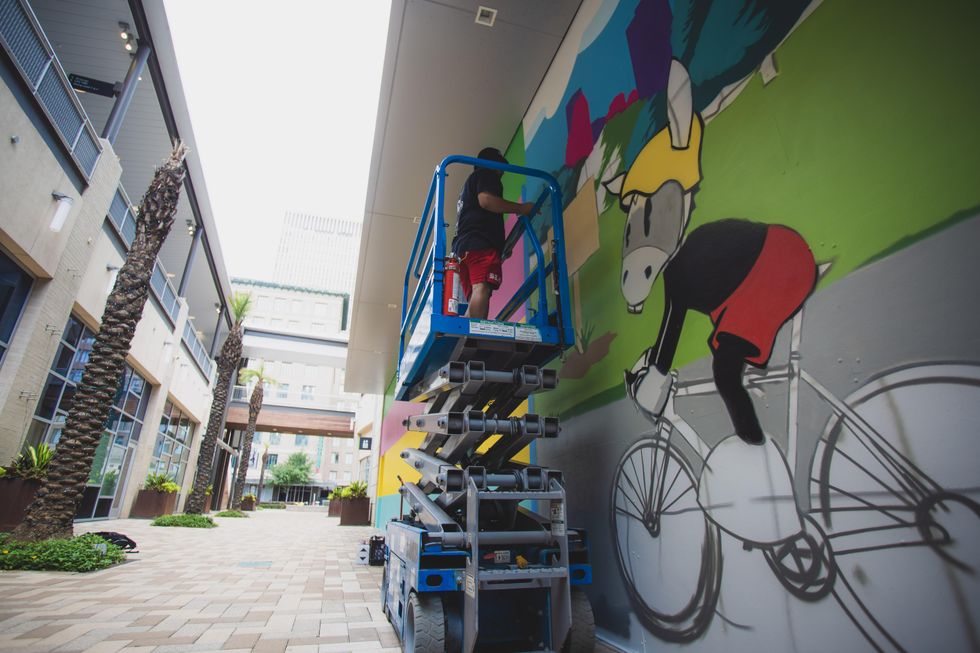 The duo's colorful new mural for GreenStreet — it combines vivid hues and color blocking with a cartoon donkey on a whimsical bike ride — was made in partnership with electric bike makers Bosch eBike Systems, which are the makers of the electric drive systems available in BCycle stations throughout the city, including the GreenStreet station near the new mural. "We're excited to partner with Bosch and GreenStreet to promote the 'Bike Through H-Town' initiative," said Donkeeboy in a statement. "Houston is such a bikeable city, and cycling is a healthy and sustainable way to get around it."