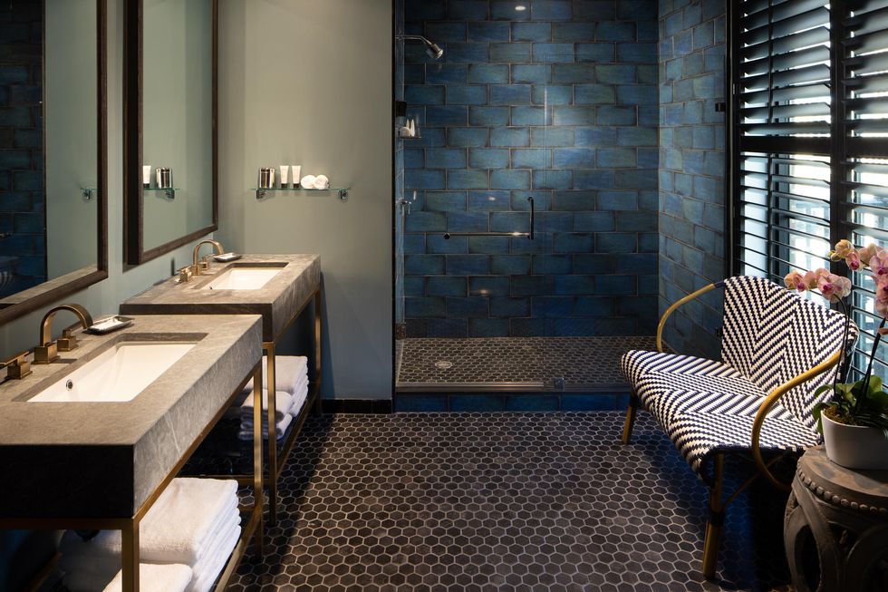 The hotel is luxurious without being stuffy; unique design elements, like a mod sculptural light fixture hanging over boho-upholstered spindle-leg chairs in the lobby, lend a right-at-home feel. Guest rooms are spacious, and come equipped with a hand-signed "cleanliness" report as well as a "Fresh Air" purifying machine.